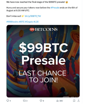 未來六天是購買$99BTC的最后機會,強烈的FOMO情緒正在蔓延。預售最后階段將于8月6日UTC時間上午9:30結束,這意味著潛在買家確實沒有時間可以浪費。