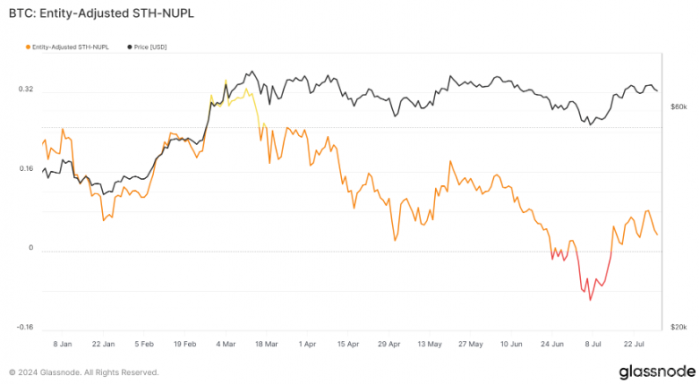 今年,STH-NUPL 與 LTH 同行一樣波動。該比率在3月份進入0.24以上的看漲區域,但在6月下旬和7月中旬跌至零以下的區域,這一下降反映了市場的嚴重調整和短期持有者的進一步恐慌。自7月7日以來,STH-NUPL一直處于上升趨勢,突破零水平并于7月15日進入充滿希望的階段。截至7月31日,該指數達到0.033,略低于7月27日的近期高點0.081。這種上升趨勢表明短期持有者的市場情緒正在逐步復蘇,盡管謹慎和不確定性仍然存在。