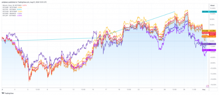 近期對CEX上Bitcoin(BTC)與法定貨幣交易對的分析揭示了其表現(xiàn)的顯著差異,特別是在全球平均價格背后的細(xì)節(jié)。這些差異反映了流動性,地緣政治和經(jīng)濟擔(dān)憂以及市場情緒對交易對表現(xiàn)的影響。