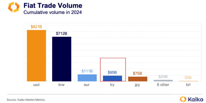 阿根廷的高通脹率和土耳其的經(jīng)濟挑戰(zhàn)是導(dǎo)致BTC/ARS和BTC/TRY強勁表現(xiàn)的主要原因。土耳其最近報告的通脹率超過75%,促使越來越多的投資者轉(zhuǎn)向Bitcoin以保護資產(chǎn)。土耳其擁有全球最高的crypto采用率,Kaiko數(shù)據(jù)顯示,土耳其里拉交易量連續(xù)8個月超過100億美元,七個交易所的里拉總交易量達到950億美元。