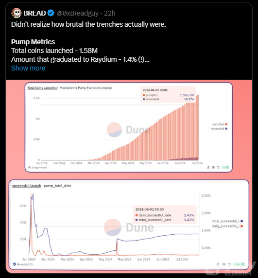 Web3開發(fā)者Bread也指出,在創(chuàng)建的158萬個Tokens中,只有22,300個真正進入了Raydium。這些數(shù)據(jù)揭示了Pump.fun上的絕大多數(shù)memecoin并未能走出生成階段,進入實際交易市場。
