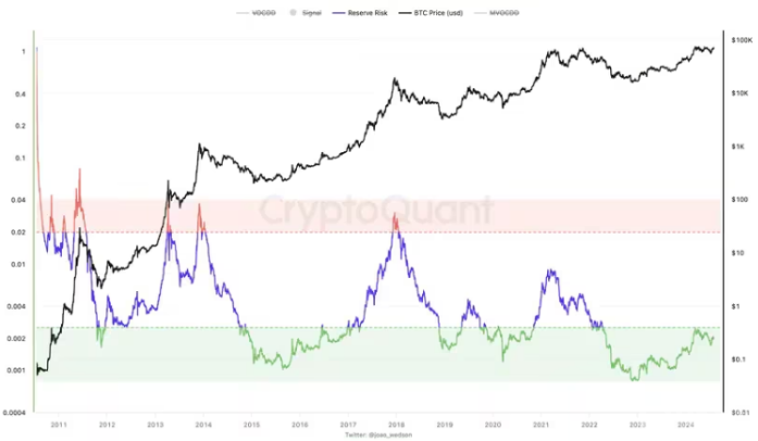 Bitcoin的“儲備風險”是衡量長期持有者信心的關鍵指標,范圍在0到1之間。根據CryptoQuant的數據,該指標保持在0.002以下的綠色區域,表明長期持有者更傾向于在當前價格下持有Bitcoin而非出售。這種供需動態對尋求新投資的投資者來說,提供了有吸引力的回報風險比。