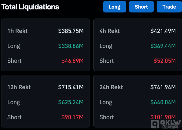 crypto市場的急劇下跌導致多頭頭寸被廣泛清算。數(shù)據(jù)顯示,過去24小時內(nèi)共清算了7.4194億美元的頭寸,其中多頭頭寸占6.4億美元,影響了197,767名交易者。