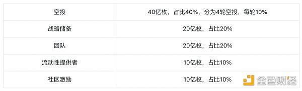 根據Whitepaper顯示:JUP 總量為 100 億枚,現在流通量為 13.5 億枚,流通率為 13.5% 。初始流通量為 13.5 億枚,其中 10 億枚用于空投, 2.5 億枚用于Launchpool,另外還有 5000 萬枚分別用于CEX做市和鏈上LP需求。總體的Tokens分配如下:
