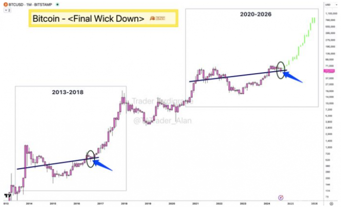 當前,Bitcoin的交易價格為56,500美元。匿名交易員Trader Tardigrade支持熊市陷阱的假設,他認為最近Bitcoin價格跌至49,000美元可能是新一輪超級牛市的開始。Trader Tardigrade在8月6日的X帖中分享了2013年的分析,指出近期下跌類似于2016年至2018年的走勢,可能預示著未來價格的新高。