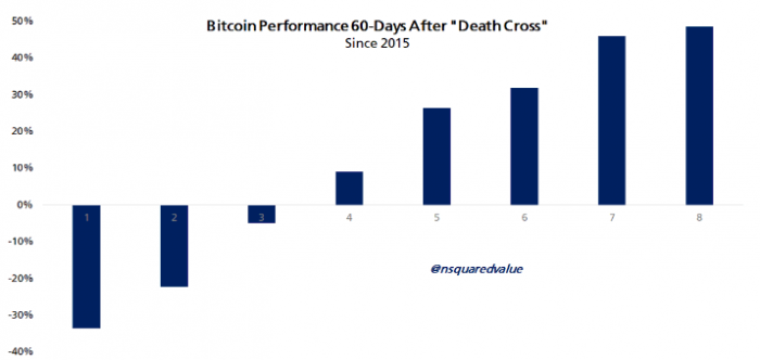Bitcoin分析師蒂莫西·彼得森分享了一張歷史圖表,顯示了自2015年以來的死亡交叉情況。他指出:“死亡交叉并沒有那么危險!弊2015年以來,死亡交叉出現了八次,而每次死亡交叉后的兩個月內,Bitcoin價格平均上漲了67%。彼得森還表示,平均回報率為18%。