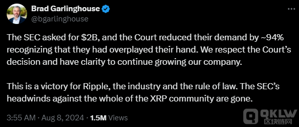 自2020年12月SEC 首次提起訴訟以來,這一裁決似乎標(biāo)志著 Ripple 與 SEC 的案件接近尾聲。SEC 當(dāng)時指控 Ripple 使用 XRP 作為未注冊證券進(jìn)行資金籌集。2023年7月,托雷斯法官裁定 XRP Tokens不應(yīng)被視為證券,并在2023年撤回了對 Ripple 執(zhí)行主席 Chris Larsen 的所有指控。