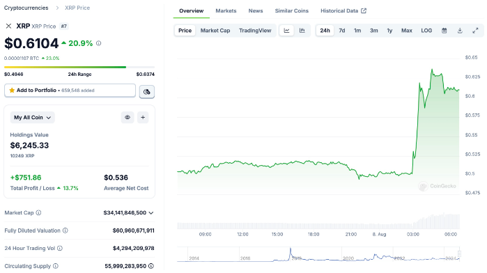 裁決結(jié)果公布后,XRP 的價格出現(xiàn)了顯著上漲。XRP 價格在24小時內(nèi)上漲超過20%,目前交易價格為0.6104美元。