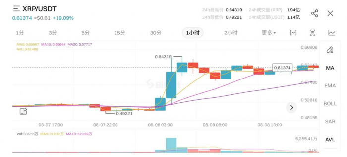 隨后,Ripple首席執行官Brad Garlinghouse在推特上表示,該裁決可視作該項目與行業的共同勝利。受此影響,XRP價格短時大漲,從8月8日3時的0.499美元一路上漲至5時的0.64美元高點,2小時內最高漲幅超過28%。
