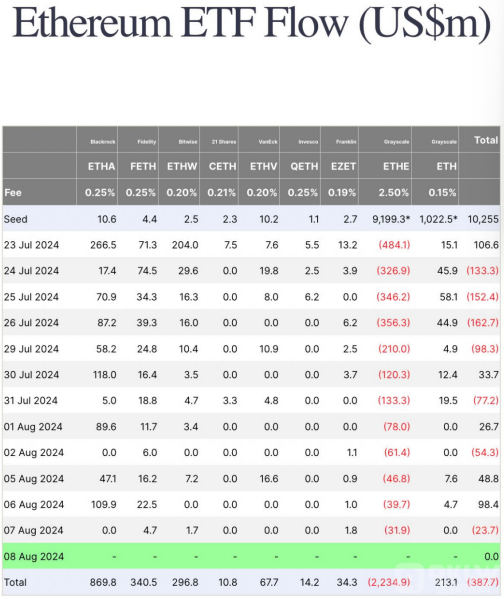 美國推出的現貨ETH ETF未能引起投資者的熱烈反響。根據Farside Investors的數據,自7月23日這些基金開始交易以來,已經出現了3.877億美元的資金撤出。相比之下,BitcoinETF在2023年1月11日推出后的前兩周內資金流入表現積極。