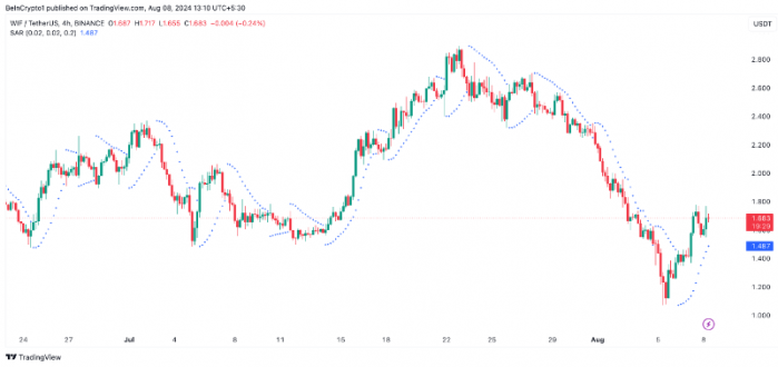 此外,WIF的拋物線止損和反轉(SAR)指標進一步支持了看漲觀點。該指標的點位于meme幣價格下方,說明當前市場趨勢為上升趨勢。這一技術信號暗示,WIF的價格可能會繼續上漲。