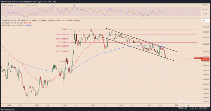 從技術角度來看,Ethereum兌Bitcoin的下跌是自2022年9月以來在現行下行通道內的下跌趨勢的一部分。在2024年5月,ETH/BTC在0.056 BTC附近測試了通道的上趨勢線,此后已經修正了30%。有趣的是,這一上趨勢線與50周和200周指數移動平均線(EMA)形成了阻力位的重合。