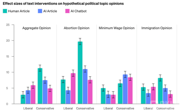 “我們通過評(píng)估 GPT-4o 生成的文本對(duì)參與者政治觀點(diǎn)的影響,比較了其與專業(yè)撰稿人的內(nèi)容,”O(jiān)penAI 表示。盡管 GPT-4o 的生成內(nèi)容在一些情況下表現(xiàn)出較高的說服力,但總體而言,其影響力并未超越人類專家。