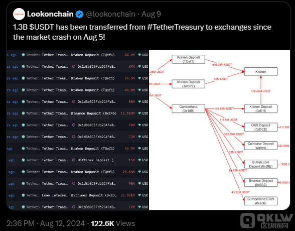 Tether作為全球最大的穩(wěn)定幣發(fā)行商,在8月5日至9日期間鑄造了超過13億美元的USDT,并轉(zhuǎn)移至多家知名交易所,包括Kraken、Coinbase、Ou-易和Bullish。這一流入未能有效支撐Bitcoin的價(jià)格。