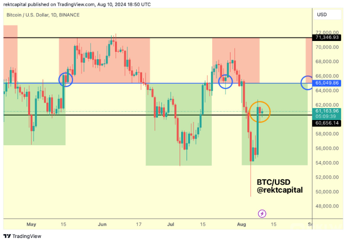 Bitcoin價(jià)格在8月5日觸及五個(gè)月來的低點(diǎn)49,500美元,但在8月9日回升超過21%,重新站上60,000美元以上。盡管如此,分析師Rekt Capital表示,Bitcoin需要重新確認(rèn)60,600美元的支撐位,才能為后續(xù)上漲提供動(dòng)力。他指出:“Bitcoin一旦重回60,600美元,將有望測試65,000美元的阻力位。”