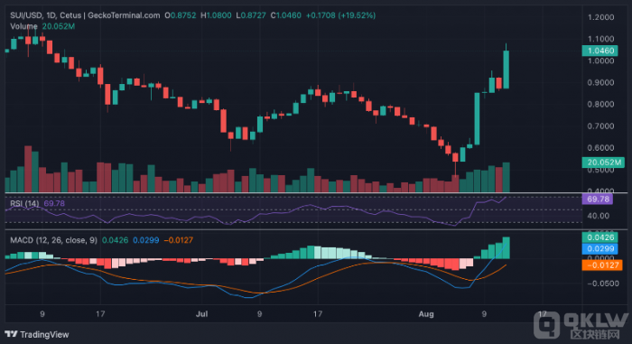Sui Network的原生TokensSUI在過去30天內顯示出令人矚目的增長,截至目前,其交易價格已達到1.05美元,并在過去一周內上漲了119.2%。