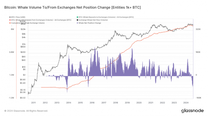 Bitcoin鯨魚交易量往返交易所凈持倉變化。資料來源:Glassnode
