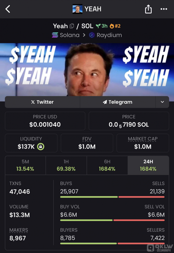 但特朗普和馬斯克作為Meme文化中的流量之王,加密愛(ài)好者自然不肯輕易錯(cuò)失二者聯(lián)動(dòng)時(shí)所能產(chǎn)生的熱點(diǎn)。僅僅是因?yàn)轳R斯克對(duì)談期間一句“YEAH”的口頭禪,不明身份的用戶便借題發(fā)揮,在Solana鏈上發(fā)布了一個(gè)同名的資產(chǎn)。