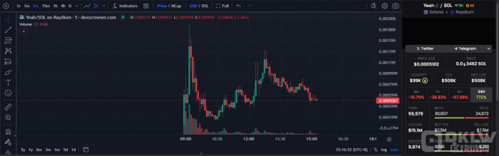 Raydium數(shù)據(jù)顯示,YEAH上線半個(gè)小時(shí)左右便迎來(lái)了一波拉盤(pán),其市值也在同一時(shí)間內(nèi)攀升至200萬(wàn)美元,但隨著對(duì)談的結(jié)束其價(jià)格大幅暴跌。