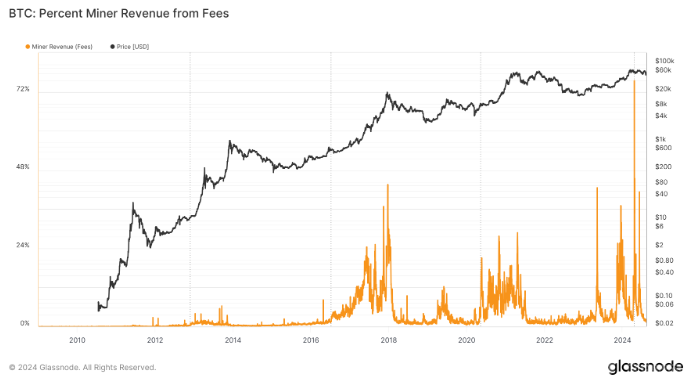 隨著B(niǎo)itcoin減半周期的臨近,交易費(fèi)用在礦工收入中的重要性愈發(fā)顯著。歷史數(shù)據(jù)顯示,礦工的費(fèi)用收入在網(wǎng)絡(luò)活動(dòng)頻繁和擁堵的時(shí)期會(huì)顯著上升,尤其是在牛市和協(xié)議升級(jí)期間。