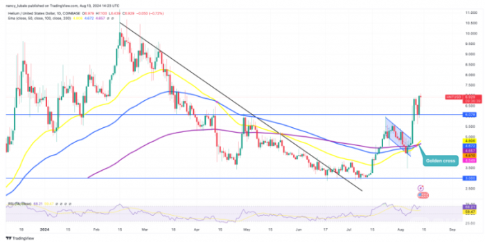 HNT的上漲與美國兩家主要運營商測試將流量轉移到Helium網絡的消息密切相關,這一進展可能促進網絡的Decentralization。技術上,HNT形成了“金十字”,RSI值為68,表明看漲勢頭仍在持續,價格有望接近2024年3月的9.60美元高點。