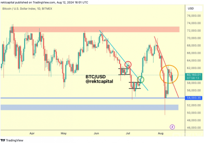 目前,Bitcoin自7月28日以來(lái)的下跌趨勢(shì)仍在延續(xù),市場(chǎng)情緒較為謹(jǐn)慎。分析師 Rekt Capital 在8月12日表示,重新測(cè)試下行趨勢(shì)線的成功與否,將決定Bitcoin的后續(xù)走勢(shì)。他指出,強(qiáng)勁的買方交易量是關(guān)鍵因素。