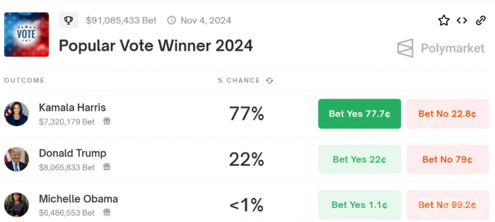 預(yù)測市場 Polymarket 數(shù)據(jù)顯示,Kamala Harris(下稱哈里斯)贏得 2024 年美國總統(tǒng)普選的概率已升至 77% ,而特朗普則下降至 21% 。一個月前因遇刺事件,特朗普的當(dāng)選概率一度上升至 70% ,遠(yuǎn)超拜登,連帶著Bitcoin迎來一波大幅上漲,最高觸及 7 萬美元高點(diǎn)。