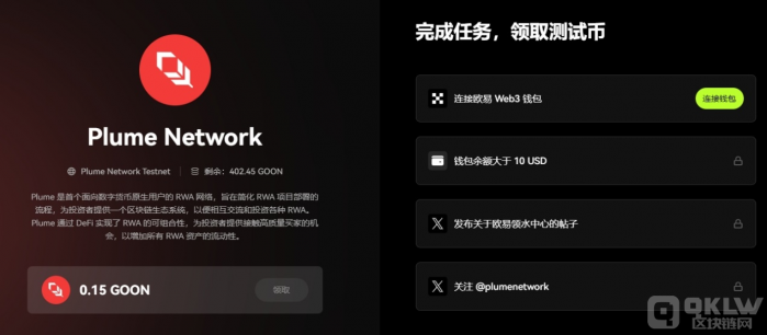如果無法通過官方水龍頭領取測試Tokens,可以嘗試使用OKX Web3錢包。OKX錢包已接入Plume測試網,用戶可以直接通過該錢包領取Plume測試網的ETH和GOON測試Tokens,并參與Plume測試網的活動,賺取Miles積分。用戶只需連接OKX Web3錢包,選擇Plume測試網絡,并完成相應任務,即可順利領取測試Tokens。