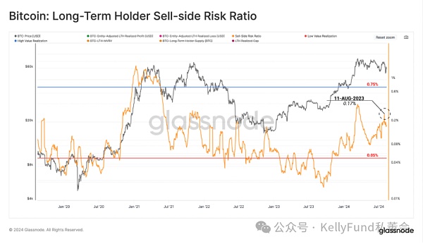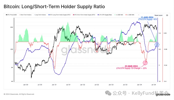 與過去周期中,Bitcoin價格突破歷史峰值之后的情況相比,目前在全網資產中,由長期持有者持有的比例相對較大。