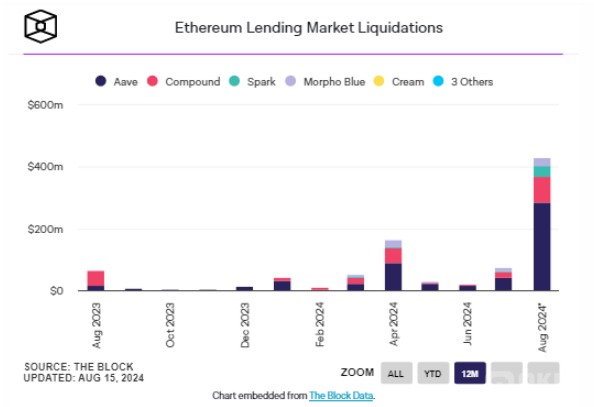 Aave的清算量增加對更廣泛的DeFi借貸市場產生了影響。8月份,DeFi借貸市場的月度清算量已經升至多年高位,迄今為止總清算金額超過4.31億美元,遠高于7月的7300萬美元。這一趨勢顯示出自2021年5月以來的最高清算水平。