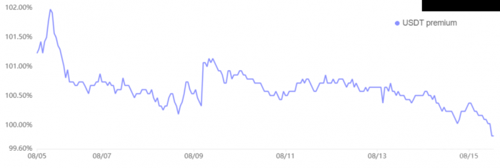 8月15日,美元兌USDT在cn的交易價(jià)格比原價(jià)低0.2%,表明crypto需求減少。這與8月6日相比有顯著變化,當(dāng)時(shí)交易員為USDT支付了2%的溢價(jià),創(chuàng)下該指標(biāo)三個(gè)月來(lái)的最低水平。