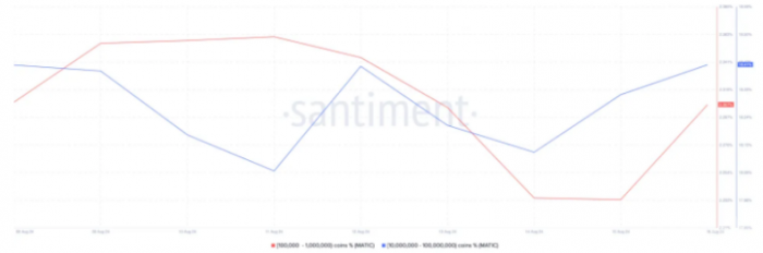 盡管多邊形(MATIC)在近期的市場表現中相對疲軟,但鯨魚的購買活動仍然引人注目。Santiment的數據顯示,持有10萬到100萬Tokens的地址余額有所增加,同時持有1000萬到1億Tokens的地址余額也有所上升。鯨魚對MATIC的增持可能與即將到來的升級有關,該升級預計將使MATICTokens在Polygon網絡中的使用得到增強。盡管本周MATIC價格下跌了4.5%,但這種購買行為可能預示著對Tokens未來的看漲預期。