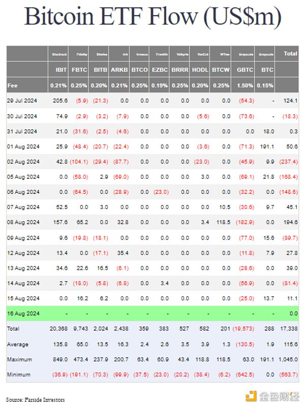 相反,市場現(xiàn)在更加關注勞動力市場和消費者健康狀況。因此,周四好于預期的零售銷售報告(以及零售巨頭沃爾瑪同時發(fā)布的強勁收益)緩解了對經(jīng)濟即將放緩的擔憂,并大幅減少了今年美聯(lián)儲預計的降息幅度,降至不到100個基點(或1%)。在其他條件不變的情況下,這些發(fā)展應該對Bitcoin和Ethereum等風險資產(chǎn)構成支持,但上周的價格明顯讓看漲者失望(詳情見下文)。4、情緒和資金流向