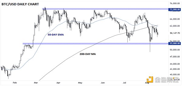 與此同時,Ethereum交易平臺交易基金(尤其是高費用的傳統(tǒng)灰度產(chǎn)品(ETHE))的資金流出開始略有減緩。這些資金流出僅在短短3周內(nèi)就已經(jīng)達到基金總額近30%,可能會在接下來的幾周繼續(xù),直到根據(jù)其費率結構達到更適當?shù)馁Y產(chǎn)水平。5、Bitcoin技術分析:BTC/USD日線圖