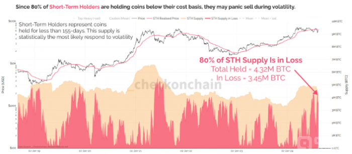 鏈上分析師 James Check 指出,超過80%的短期Bitcoin持有者在購買時的價格高于當(dāng)前價格,這使他們面臨虧損風(fēng)險。短期持有者是指持有Bitcoin時間少于155天的人。Check 警告稱,如果這些投資者開始恐慌性拋售,可能會導(dǎo)致價格進一步下跌,這種情況類似于2018年、2019年和2021年中期的市場走勢,當(dāng)時許多投資者因恐慌而引發(fā)了看跌趨勢。