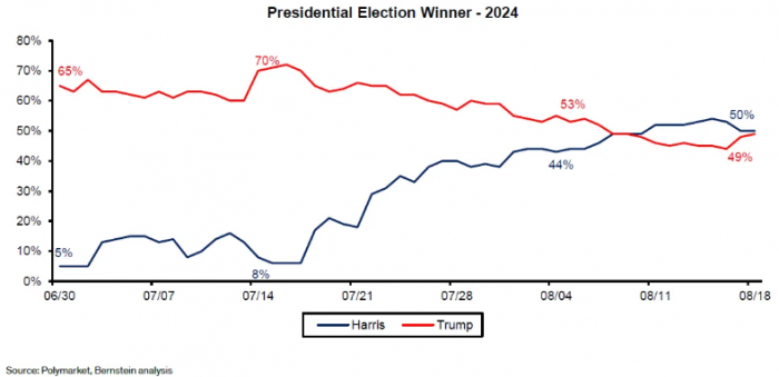 根據crypto預測平臺Polymarket的最新數據,共和黨候選人特朗普與民主黨候選人卡馬拉·哈里斯之間的競爭非常緊張。在哈里斯的一系列經濟聲明受到負面反響后,特朗普的勝算在最近幾天有所回升。哈里斯在過去24小時內略微領先,目前的支持率為49%,而特朗普為48%。