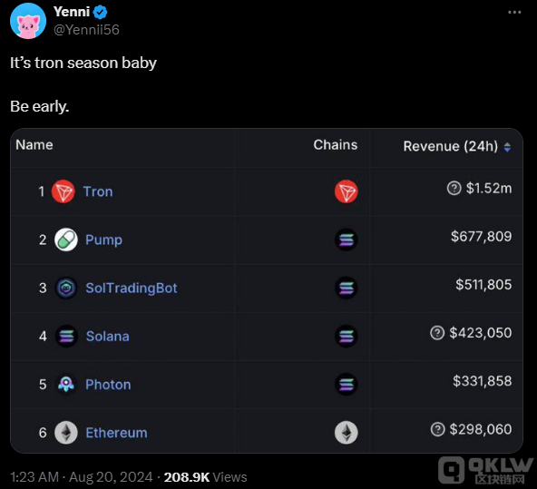 Sundog的迅速崛起讓人聯想到Solana上的熱門模因幣Dogwifhat(WIF),這標志著Tron網絡上的模因幣熱潮正在加速。Tron上的流動性也在增加,目前該網絡的收入已超過106萬美元。根據DeFiLlama的數據,過去24小時內Tron的收入表現強勁,而Dune Analytics則顯示,SunPump平臺上已創建超過11,000個Tokens,并且SunPump剛剛宣布與DEX Screener完成了集成。