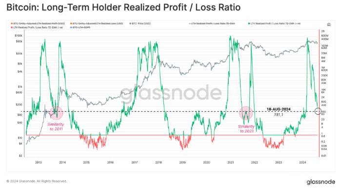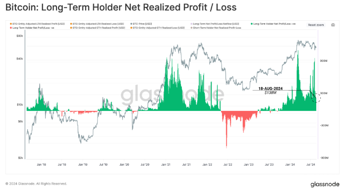 根據(jù)Glassnode的最新報(bào)告,Bitcoin的長(zhǎng)期持有者在當(dāng)前橫盤(pán)走勢(shì)中每天仍保持約1.38億美元的利潤(rùn)。這表明市場(chǎng)上仍有大量資金流入,以吸收拋售壓力,從而在波動(dòng)的市場(chǎng)中維持Bitcoin價(jià)格的相對(duì)穩(wěn)定。