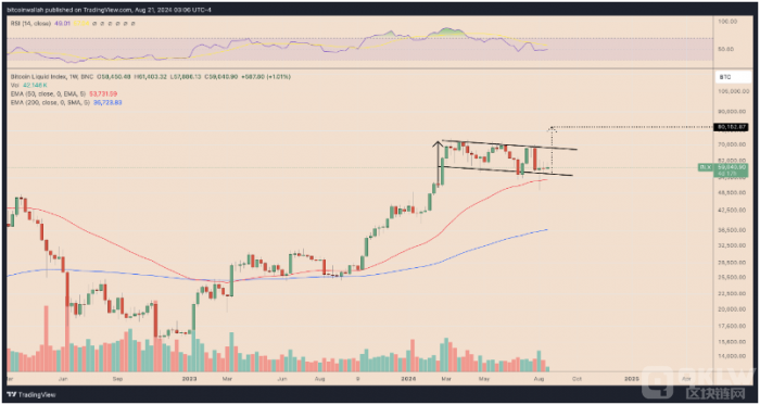 從技術(shù)角度來(lái)看,Bitcoin的價(jià)格走勢(shì)呈現(xiàn)出牛旗形態(tài),自3月份以來(lái)一直在下降平行通道中修正。若Bitcoin價(jià)格突破這一形態(tài)的上方趨勢(shì)線(xiàn),則有可能進(jìn)一步上漲,目標(biāo)價(jià)位可能達(dá)到80,000美元。
