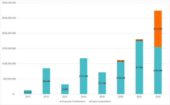 根據(jù)公共監(jiān)督組織Public Citizen的最新報(bào)告,2024年選舉周期中,近一半的企業(yè)政治捐款來自crypto公司。這種前所未有的政治支出規(guī)模,僅次于自2010年以來化石燃料行業(yè)的捐款。主要加密公司(如Coinbase和Ripple)已經(jīng)向2024年大選投入了超過1.19億美元,用于支持那些對(duì)crypto持有友好態(tài)度的候選人,并抵制那些持懷疑態(tài)度的政治人物。