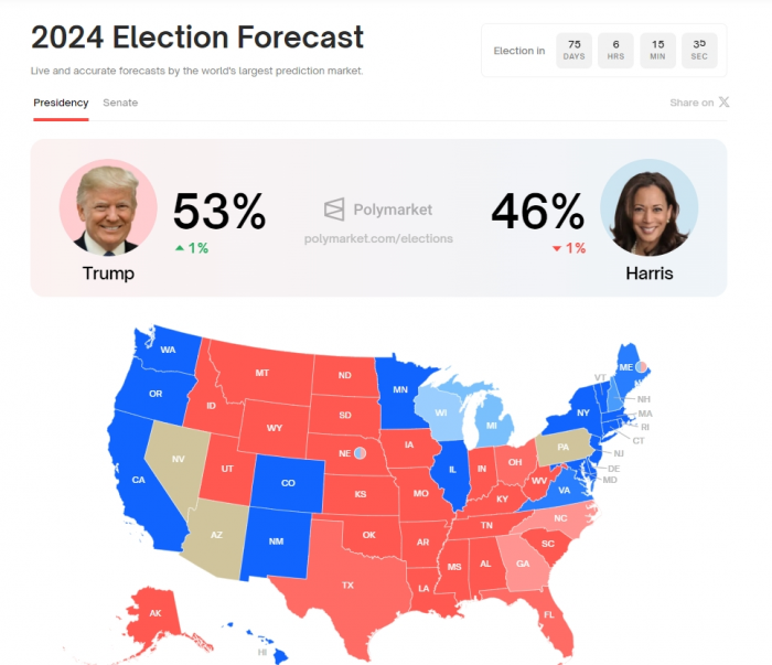 當(dāng)前在Polymarket上的美國大選預(yù)測(cè)已經(jīng)發(fā)生顯著變化:哈里斯的勝選概率從上周的53%降至46%,而特朗普的當(dāng)選概率則上升至53%。這一變化反映了哈里斯對(duì)crypto行業(yè)態(tài)度調(diào)整的影響,顯示出crypto選民在選情中的重要性。