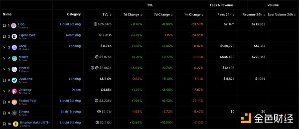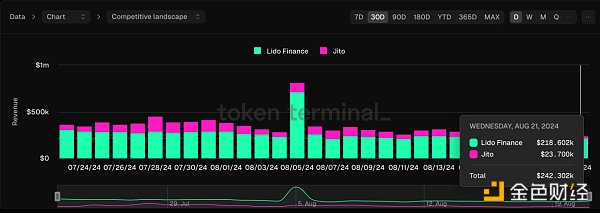 最新數據顯示,Lido目前占據流動性質押賽道近70%的份額(下圖1),在收入層面,Lido占據近80%的賽道收入(下圖2),Lido依靠著先發優勢保持領先地位,但由于與ETH的高度相關性,與去年同期相比幣價仍回調31.2%,DeFi整體表現與ETH高度綁定。