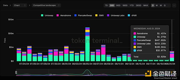 以Uniswap為例,其自三月以來收益大幅增長,而日活躍用戶數受行情熱度變化影響,在3萬至10萬之間波動(下圖1),但是Uniswap的統治地位受到了Aerodrome的挑戰(下圖2)。
