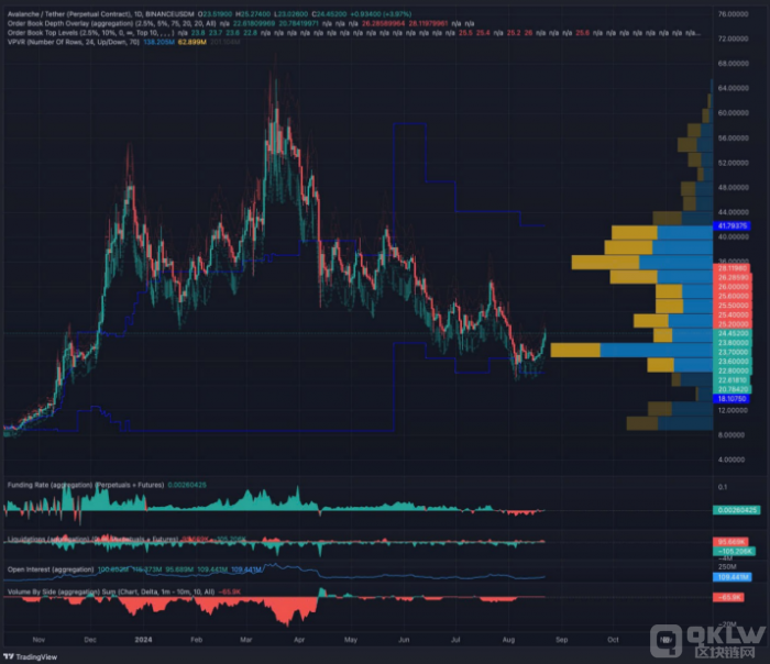 從近期的價格走勢來看,AVAX的反彈與灰度基金的公告高度一致,融資利率短暫轉為正值,清算量也有所增加。此外,現(xiàn)貨購買量的持續(xù)上升也為市場注入了活力。市場參與者普遍認為,AVAX可能會突破25至27美元的阻力位,進而追逐28至33美元的價格區(qū)間。