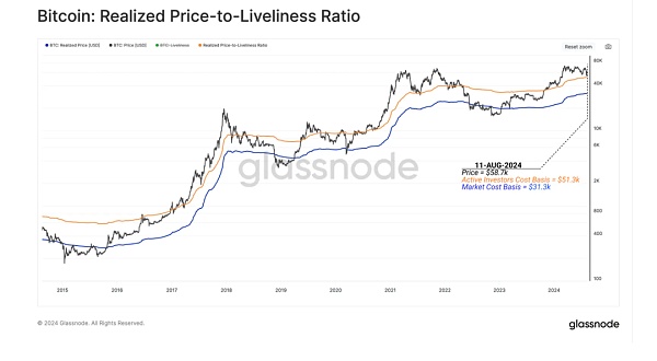 ***橙色線:實現(xiàn)價格與活躍度比率(RealizedPrice-to-LivelinessRatio,RPLR),***橙色線表示的是“實現(xiàn)價格與活躍度比率”,這是一個結(jié)合了實現(xiàn)價格和Bitcoin持有行為的指標(biāo)。它通過比較Bitcoin的“活躍度”(即Bitcoin被持有或花費的時間)來調(diào)整實現(xiàn)價格,從而估計Bitcoin的“活躍地址的持幣成本”。