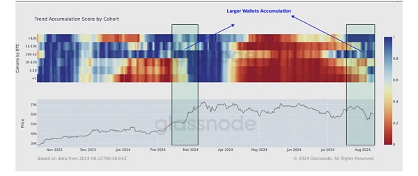 這張圖表展示的是Bitcoin不同持倉規(guī)模群體的**“趨勢積累分數(shù)”**(TrendAccumulationScore)隨時間的變化情況,顏色越藍代表著鏈上持幣者傾向于持有或者買入,越紅代表著投資者越傾向于賣出。