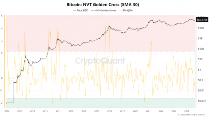 NVT金十字的30日簡單移動平均線為-0.14,顯示出Bitcoin仍有較強的看漲勢頭。一般來說,值高于2.2表示周期頂部,而低于-1則表明潛在底部。