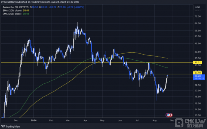 在美聯儲主席杰羅姆·鮑威爾暗示可能調整政策后,AVAX一度攀升至27美元,市場對降息的預期推動了crypto的普遍上漲。盡管AVAX隨后回調至26.60美元,但突破22.8美元的局部高點表明價格走強,目標可能指向33美元的關鍵阻力位。