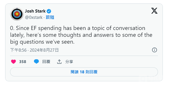 對此,Josh Stark 昨日在社交平臺 X 上發文,回應了社區對Ethereum基金會支出的關注: