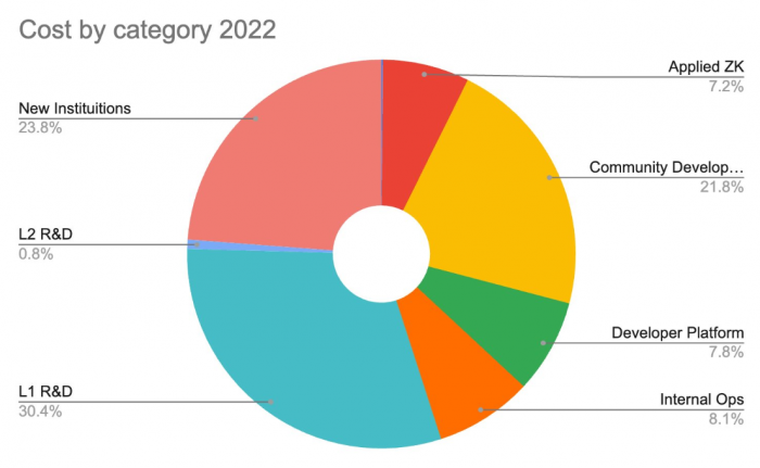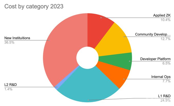 Stark 還透露了這份報告中的支出概況,包括內部和外部支出。具體而言,L1 研發的支出包括對外部項目團隊的資助以及 EF 內部的支出。其中,內部支出占 38%,外部支出占 62%。
